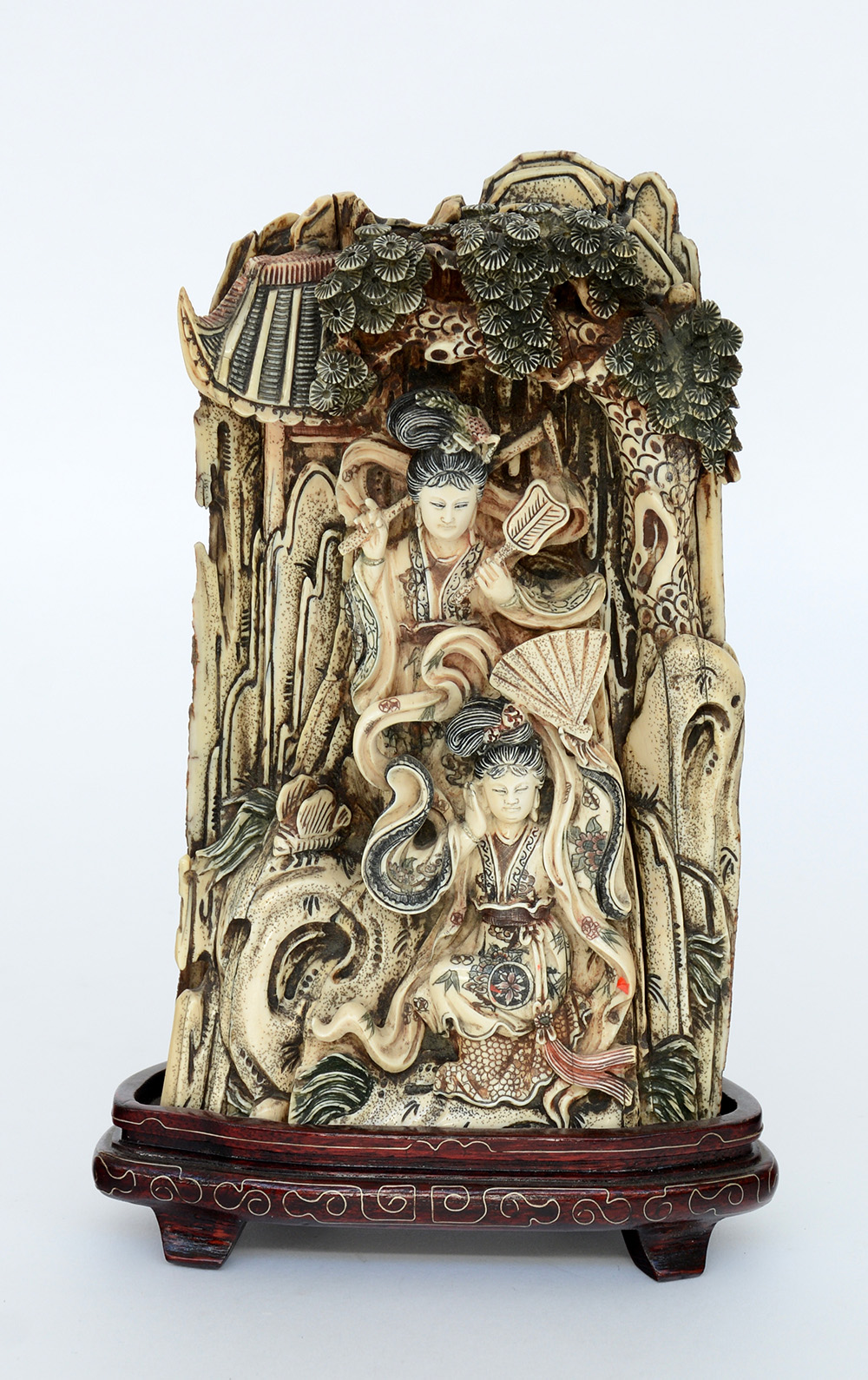 Scultura in avorio raffigurante dame tra rami, base in legno (h. 22 cm.) (difetti)