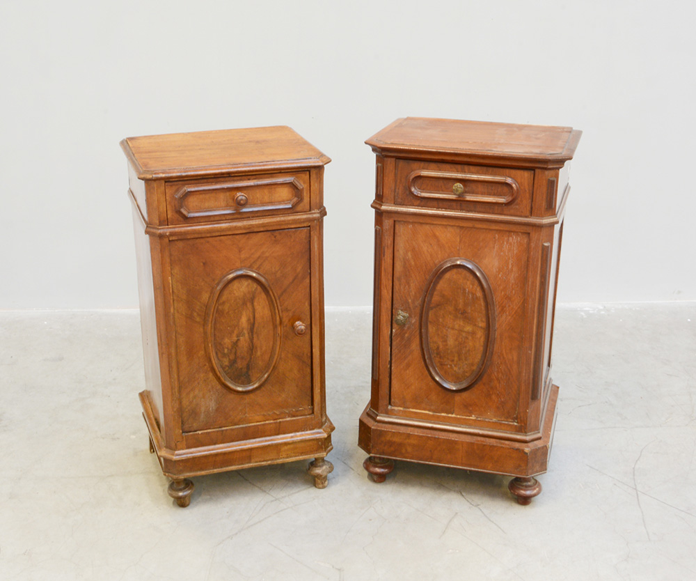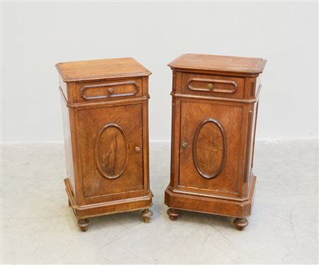 Coppia di comodini ad un cassetto e un'anta centrata da ovale. Piedi anteriori "a cipolla" (cm 42,5x78x33,5) (difetti)