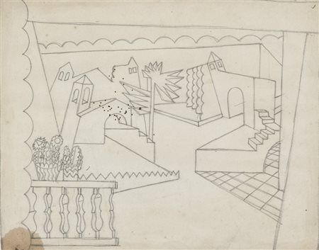 Fortunato Depero Studio per villaggio luminoso, 1918 Matita su carta, cm. 17,5x21,5 La carta presenta un ingiallimento in basso a sinistra. Sul verso: etichetta "Arte Centro", Milano, con descrizione. Esposizioni: "Depero Futurista", Dicembre 1998 - Febbraio 1999, Gallerie Studio 53 Arte e Spazio Arte, pubblicato sul catalogo della mostra, a cura di Maurizio Scudiero, pag. 19, tav. 19