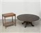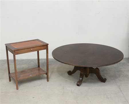 Lotto composto da un tavolino tondo da salotto (d cm 100, h cm 39) e una tavolino rettangolare con inserto in similpelle sul piano (49x55x33) (difetti)