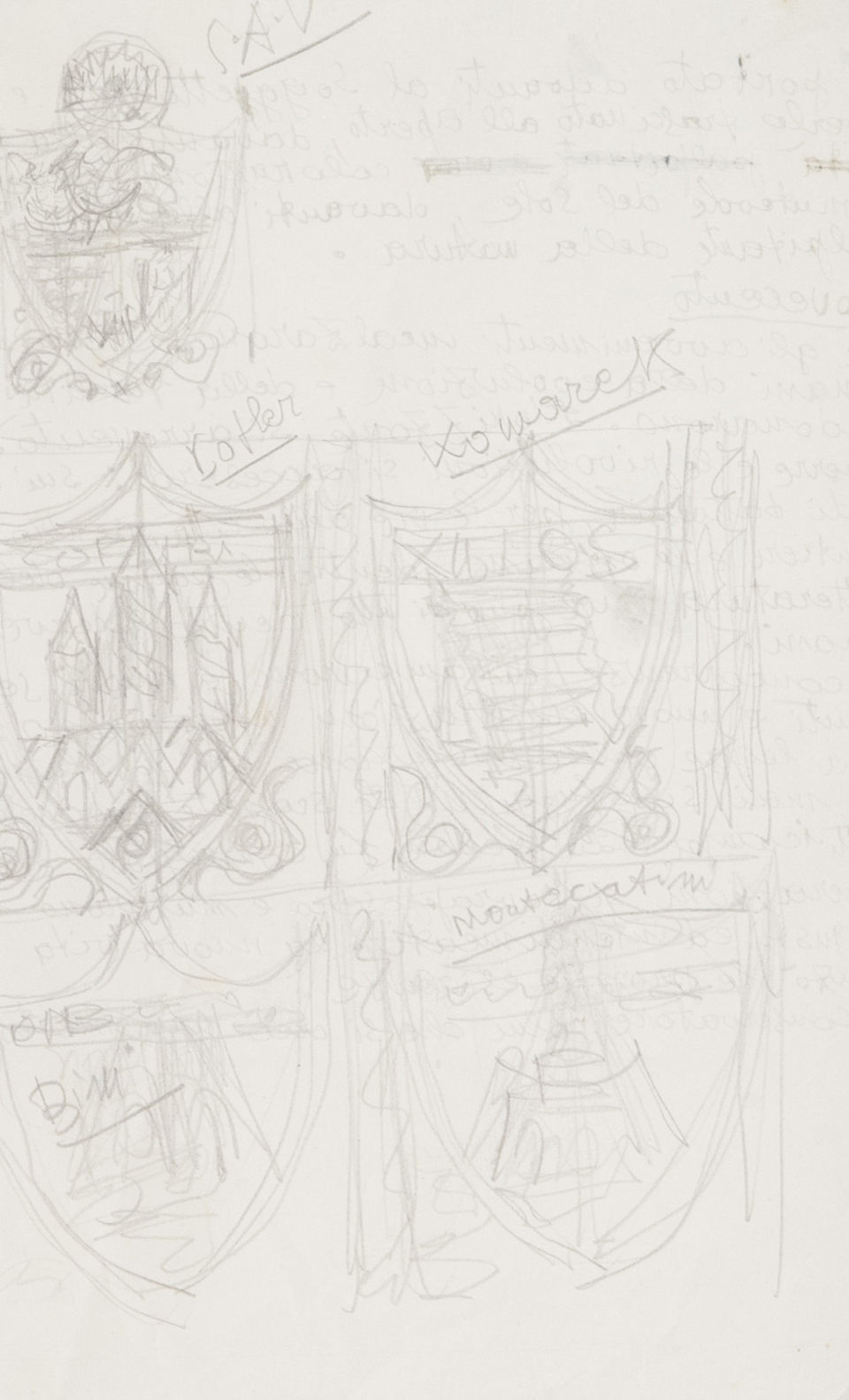 Fortunato Depero Allestimento del museo Depero, 1957/58 c.a. Matita su carta, cm. 28x22,1 Sul verso: scritto. Certificato di Archiviazione dell'Archivio unico per il Catalogo delle Opere futuriste di Fortunato Depero, con Archivio n° FD - 3797 - DIS.