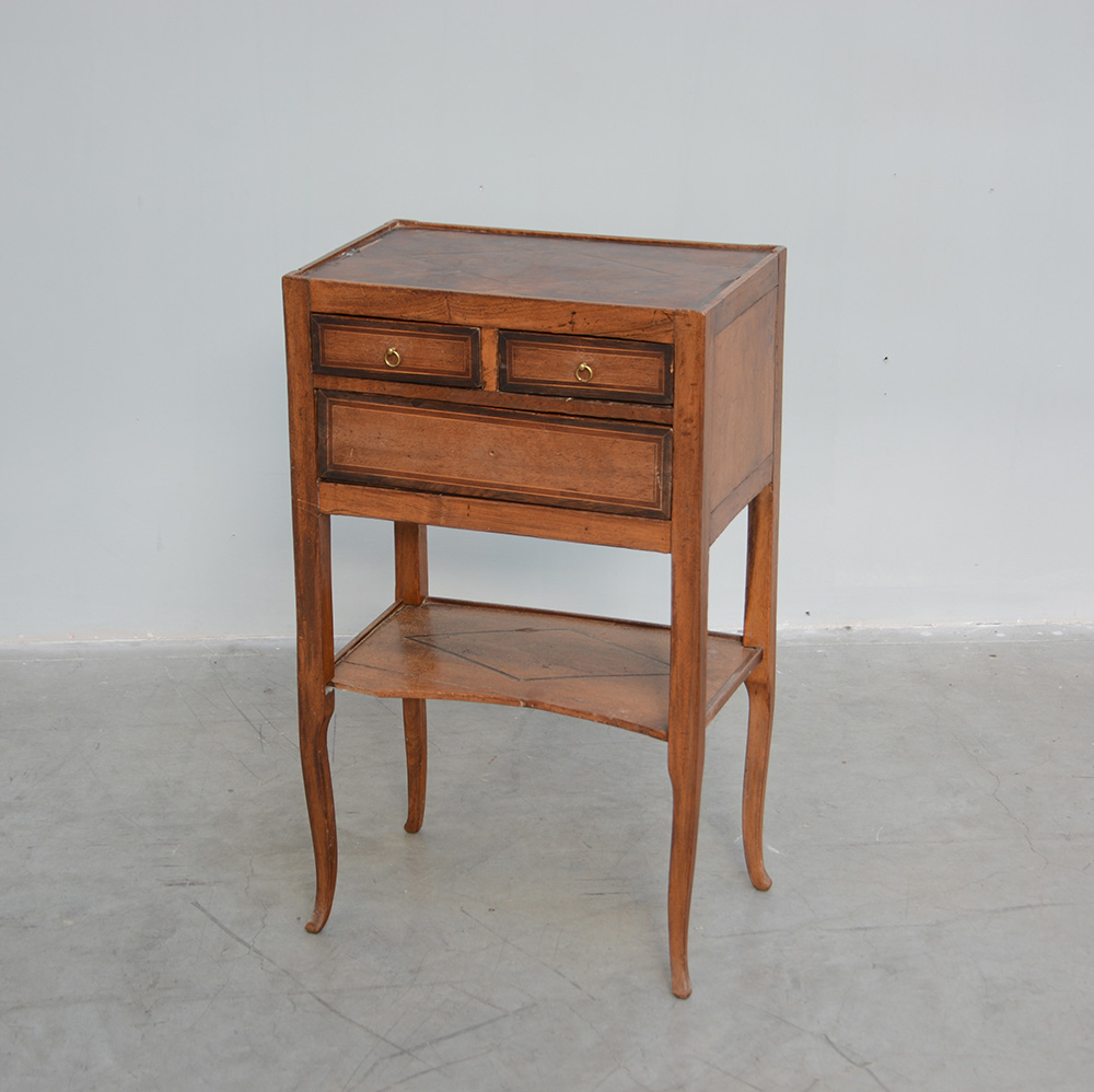 Comodino a tre cassetti con piano e fronte filettati. Secolo XIX (difetti e restauri)