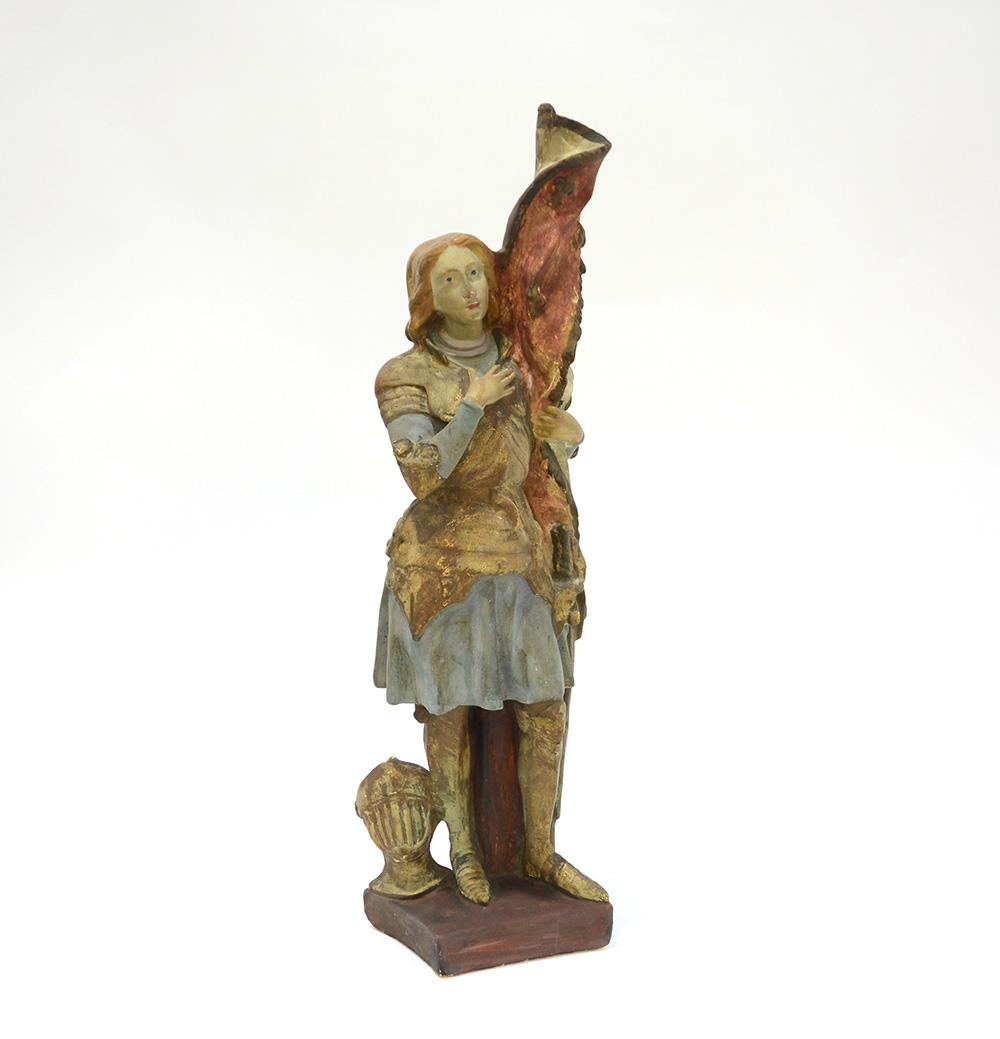 Scultura in gesso dipinto raffigurante Giovanna d’Arco (h cm 60) (difetti)