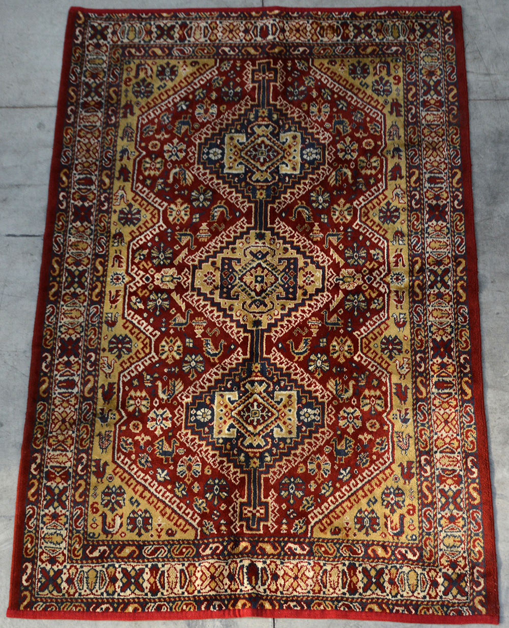 Tappeto meccanico decorato con motivo Shiraz nei toni del beige, blu e rosso (cm 215x141) (difetti)