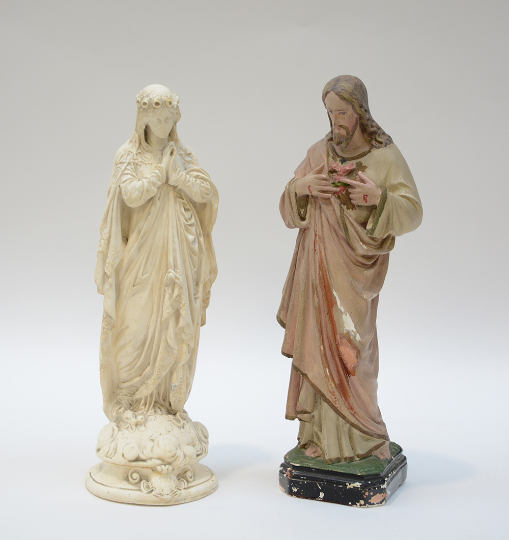 Lotto di due sculture in gesso raffiguranti la Madonna e Gesù (h max cm 41) (difetti e restauri)