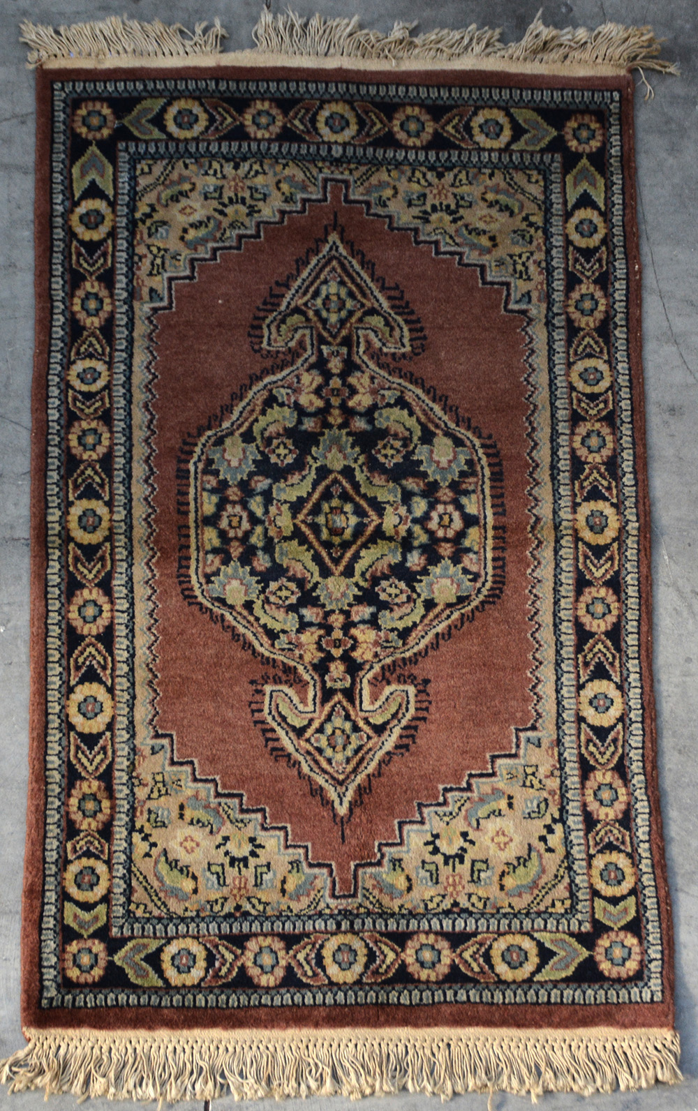 Tappeto Shrinagar, India, secolo XX. Disegno a medaglione su fondo nocciola (cm 103x61) (difetti)