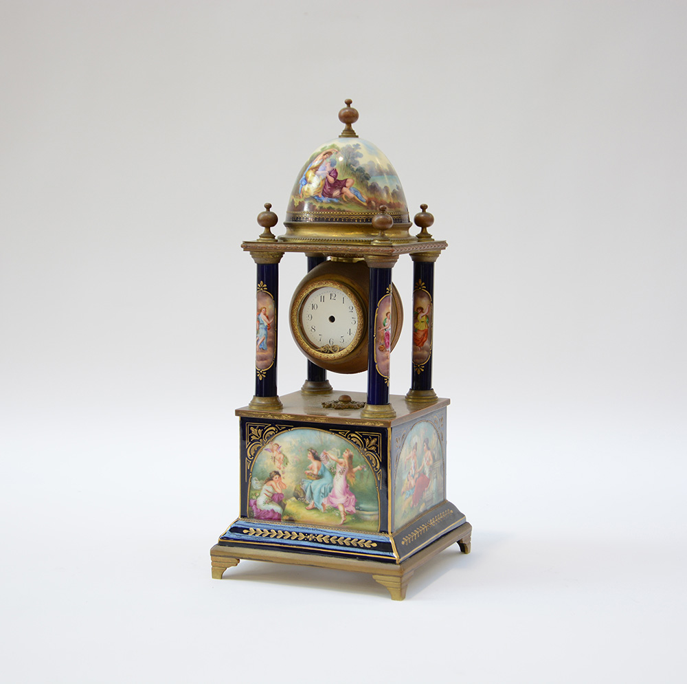 Orologio da tavolo in metallo smaltato con scene galanti, movimento elettrico...