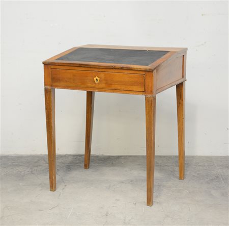 Piccolo scrittoio con cassetto nella fascia e piano reclinato con inserto in pelle. Secolo XIX (cm 72x87x61) (difetti e mancanze)