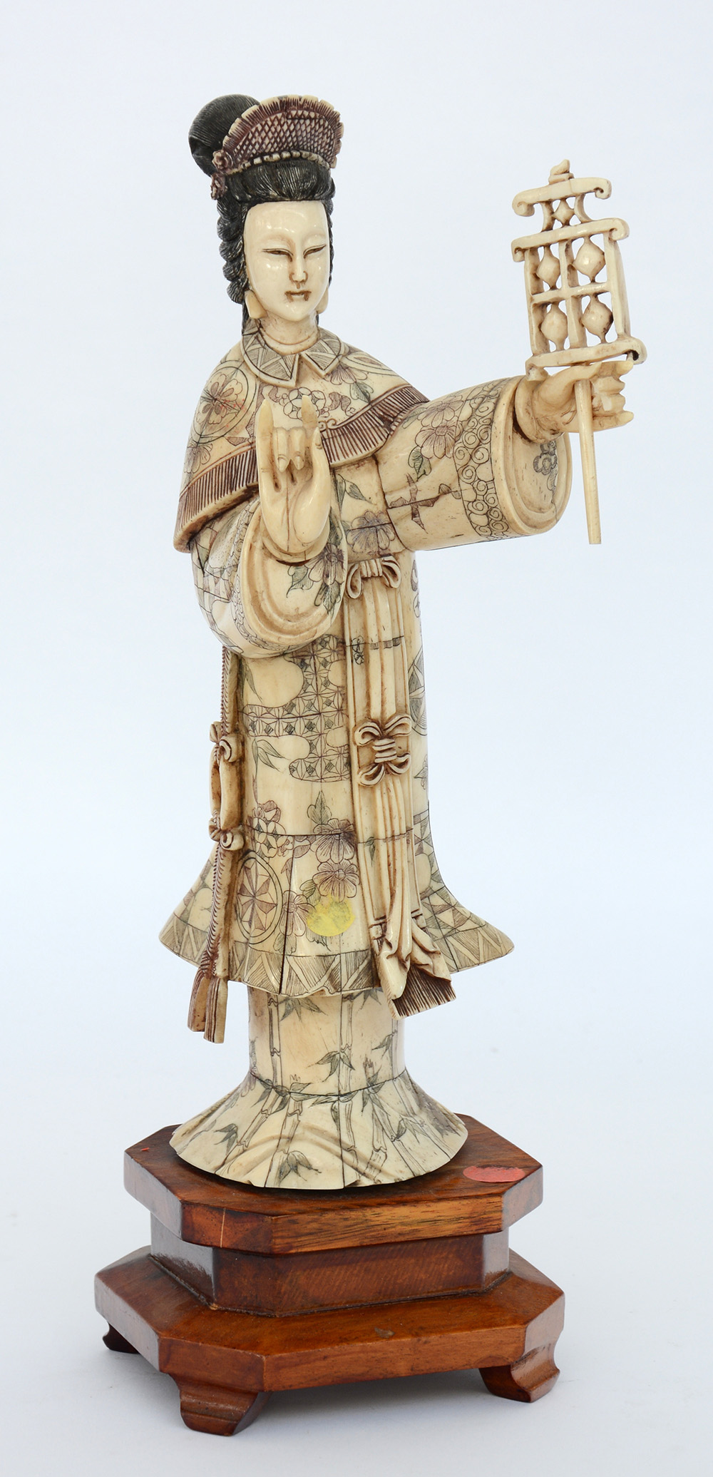 Dama dalle lunghe vesti con campane rituali in osso a tasselli con base in legno (h. 32 cm.)(difetti) Cina, sec. XX