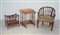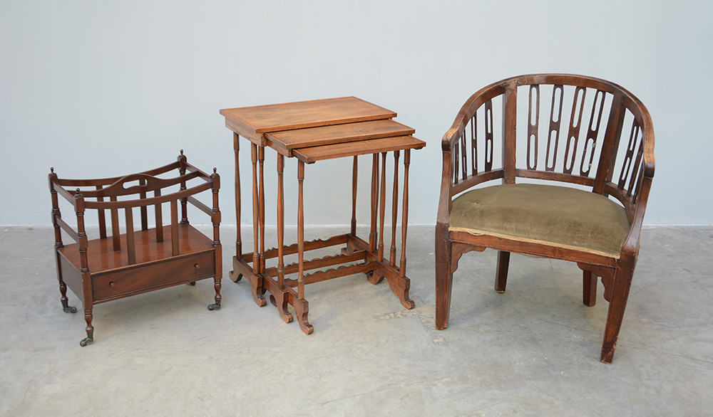 Lotto composto da un portariviste inglese con cassetto nella fascia, tre tavolini a nido e una poltroncina a pozzetto con schienale a giorno (difetti)