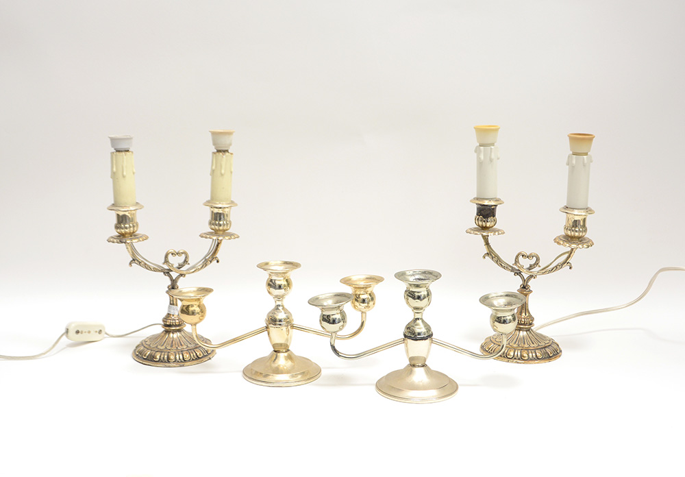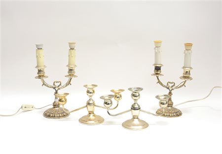 Lotto composto da due coppie di candelieri in argento e metallo argentato, una copiia montata a luce elettrica (difetti)