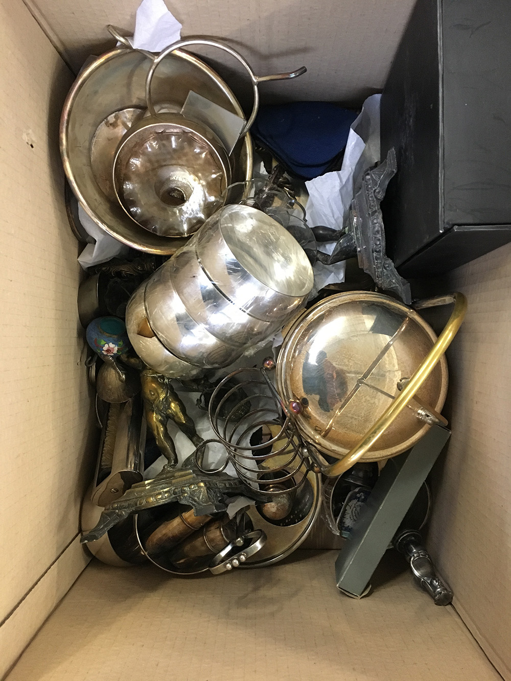 Lotto di un cartone contenente numerosi oggetti in metallo e metallo...
