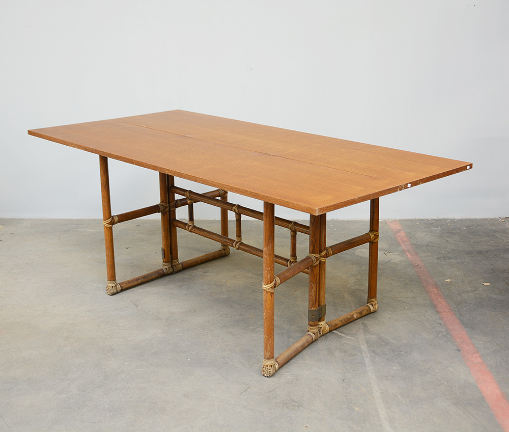 Tavolo con piano apribile e gambe in legno dolce simulanti il bambù (chiuso cm 185x76x45) (difetti)