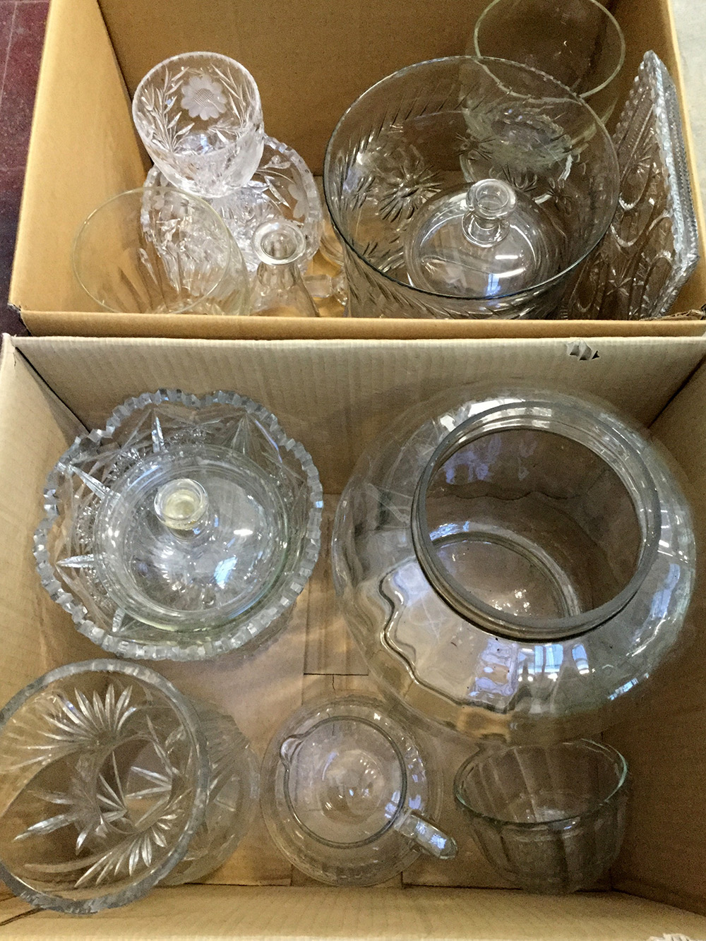 Lotto di due cartoni contenenti vasi, contenitori ed altri oggetti in cristallo molato(difetti)