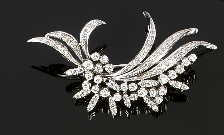 SPILLA Spilla in oro bianco, anni '50, lavorata a motivo vegetale, impreziosita con settantadue diamanti taglio brillante rotondo e taglio 8/8 per complessivi ct 1,35 ca Peso gr. 10,8