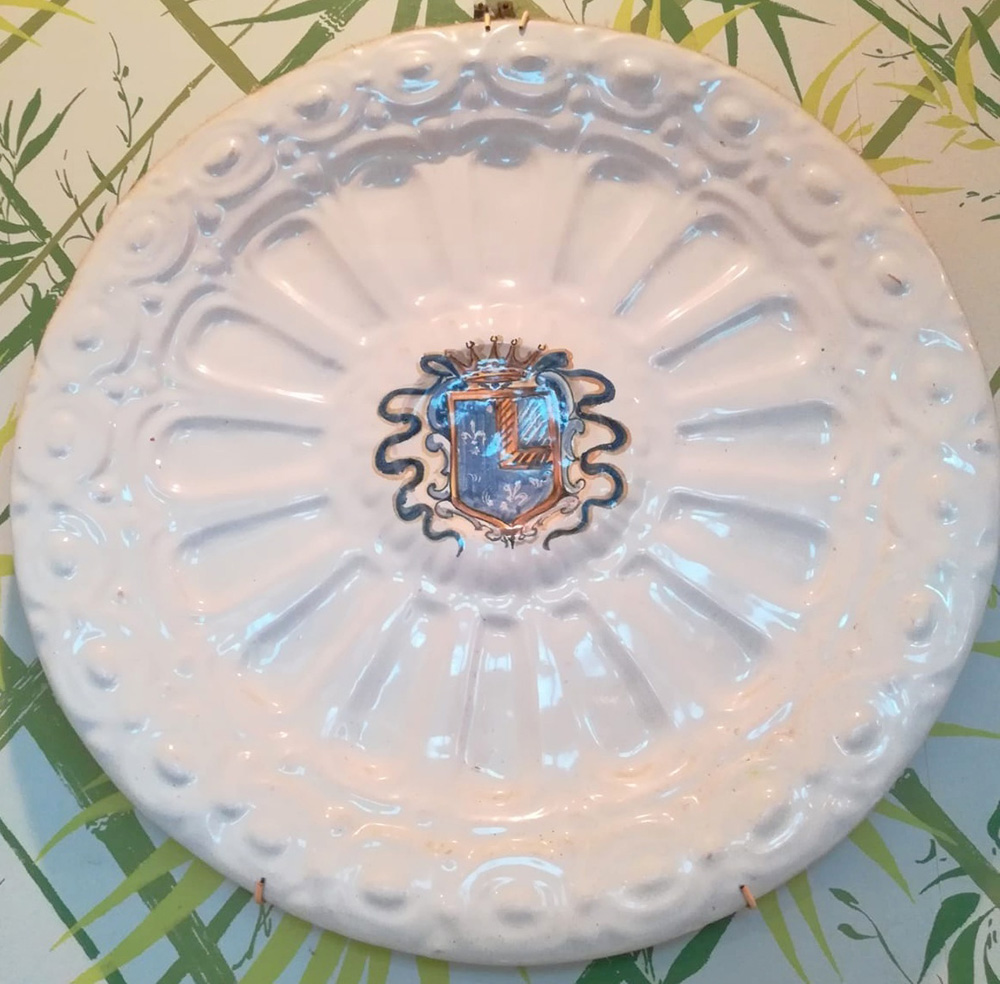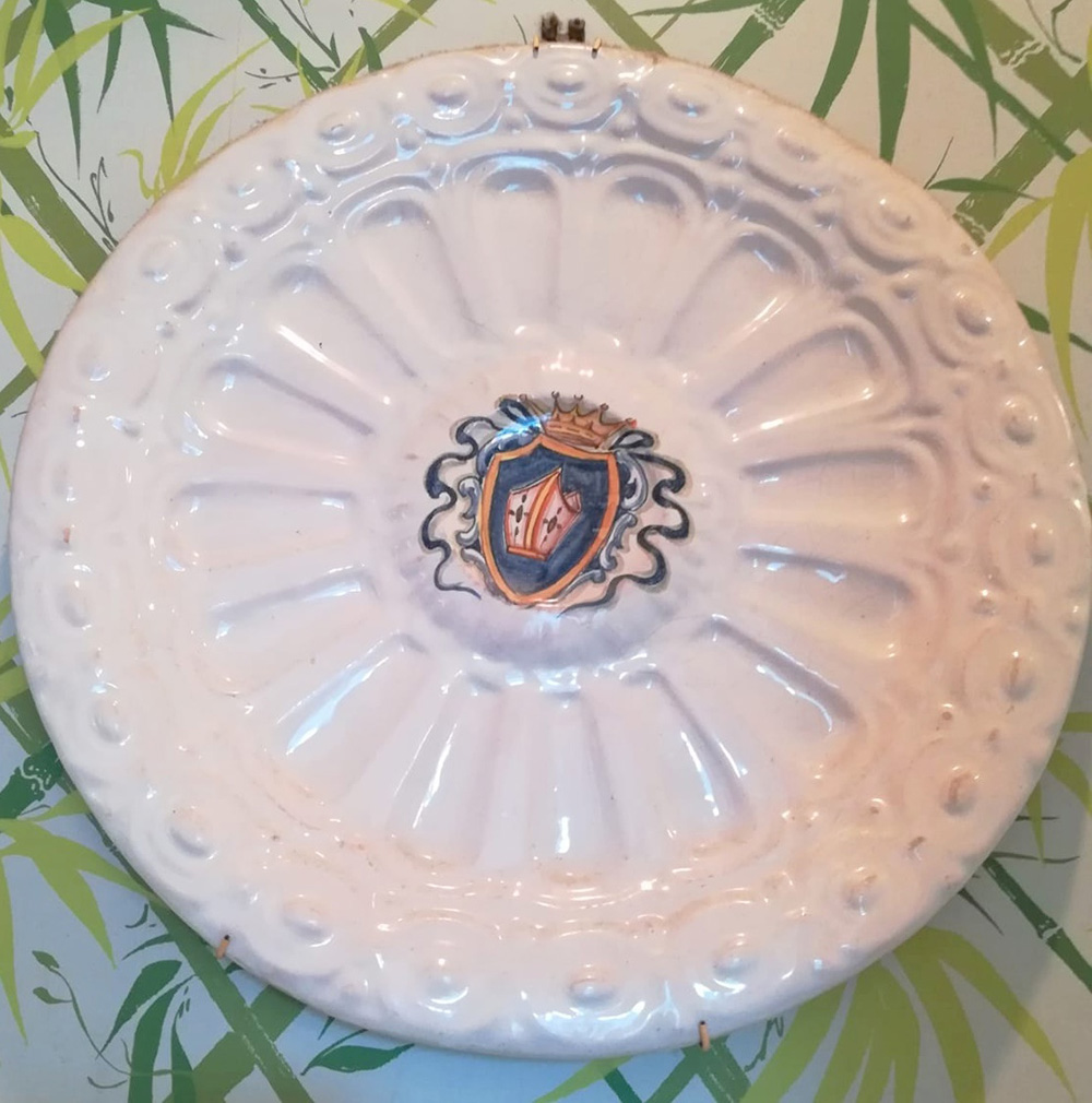Coppia di piatti decorativi in ceramica bianca centrati da stemmi gentilizi (d cm 44) (difetti)