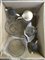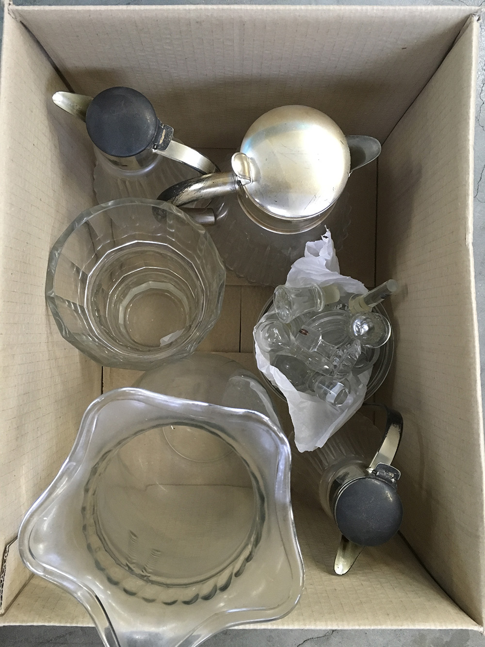 Cartone contenente tre versatoi, due vasi ed altri oggetti in vetro (difetti)