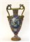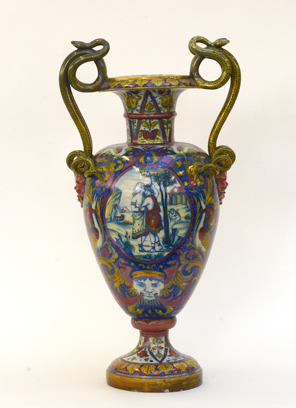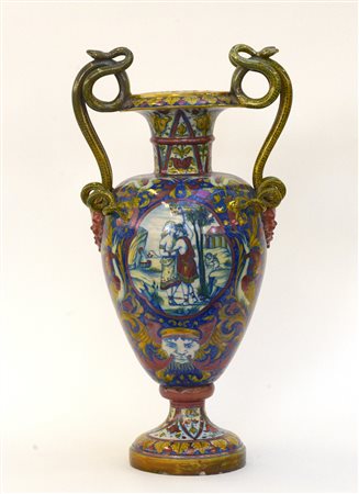 Vaso biansato in ceramica decorata in policromia a raffaellesche e medaglioni con figure in un paesaggio. Anse a forma di serpenti. (h cm 60) (difetti)