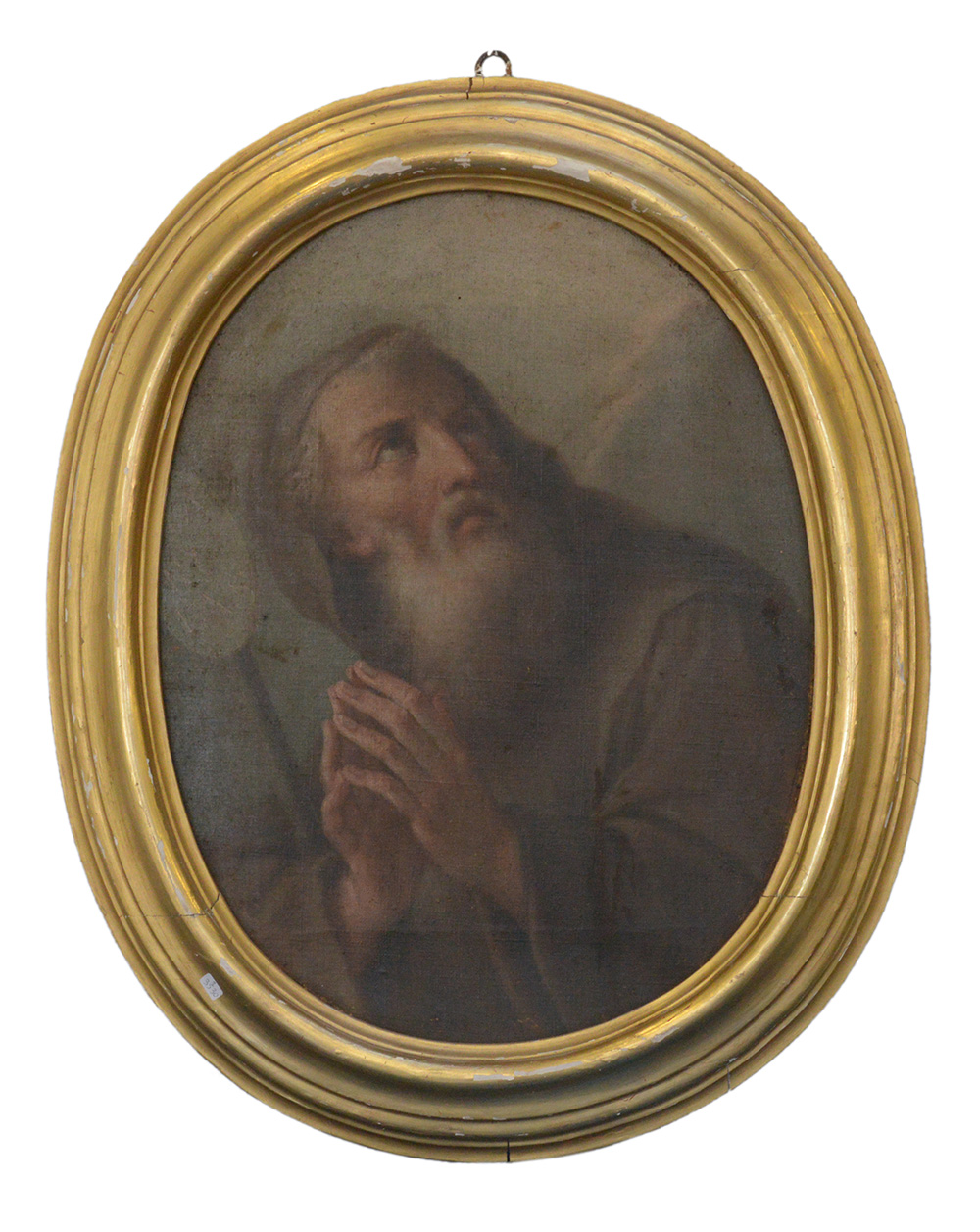 Ignoto del secolo XVIII "Sant'Antonio" olio su tela ovale (cm 60x48) in cornice dorata (difetti e restauri)