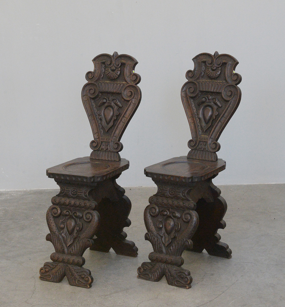 Coppia di sedie in stile rinascimentale in legno intagliato a volute, motivi...