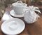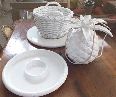 Lotto composto da una lampada da tavolo a forma di ananas, un cachepot a cesto intrecciato e due centrotavola tondi, tutti in ceramica bianca (difetti)