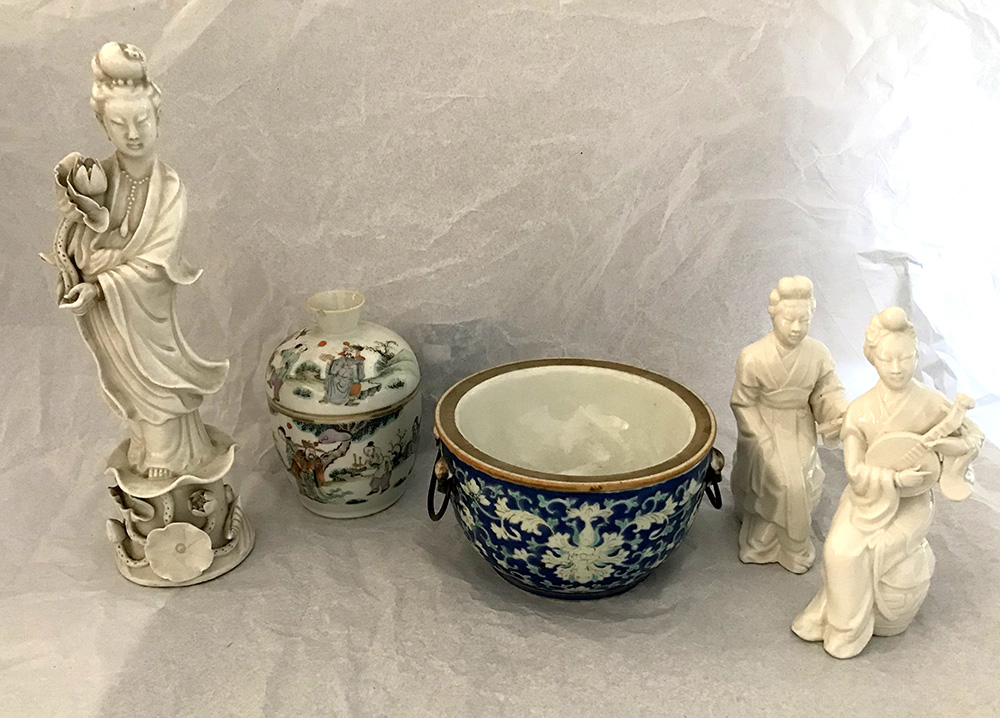 Lotto composto da una Guanyin, una coppia di suonatrici in porcellana blanc-de-Chine, un contenitore con coperchio in porcellana Famiglia ed una ciotola biansata in porcellana a fondo blu (h max 25) (difetti e restauri)