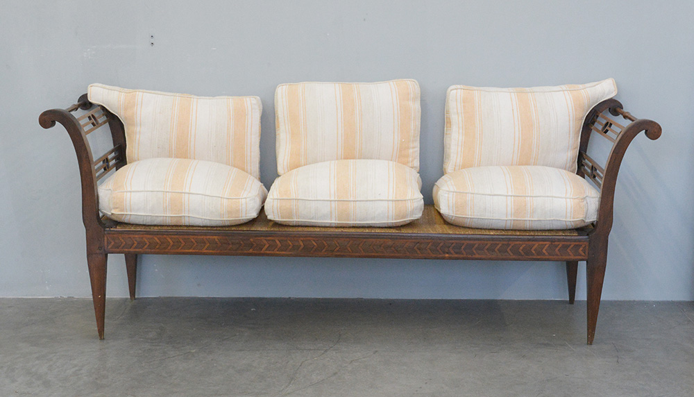 Panca con fianchi curvi e traforati, fasce intarsiate a motivi ripetuti geometrici, completa di sei cuscini (difetti)