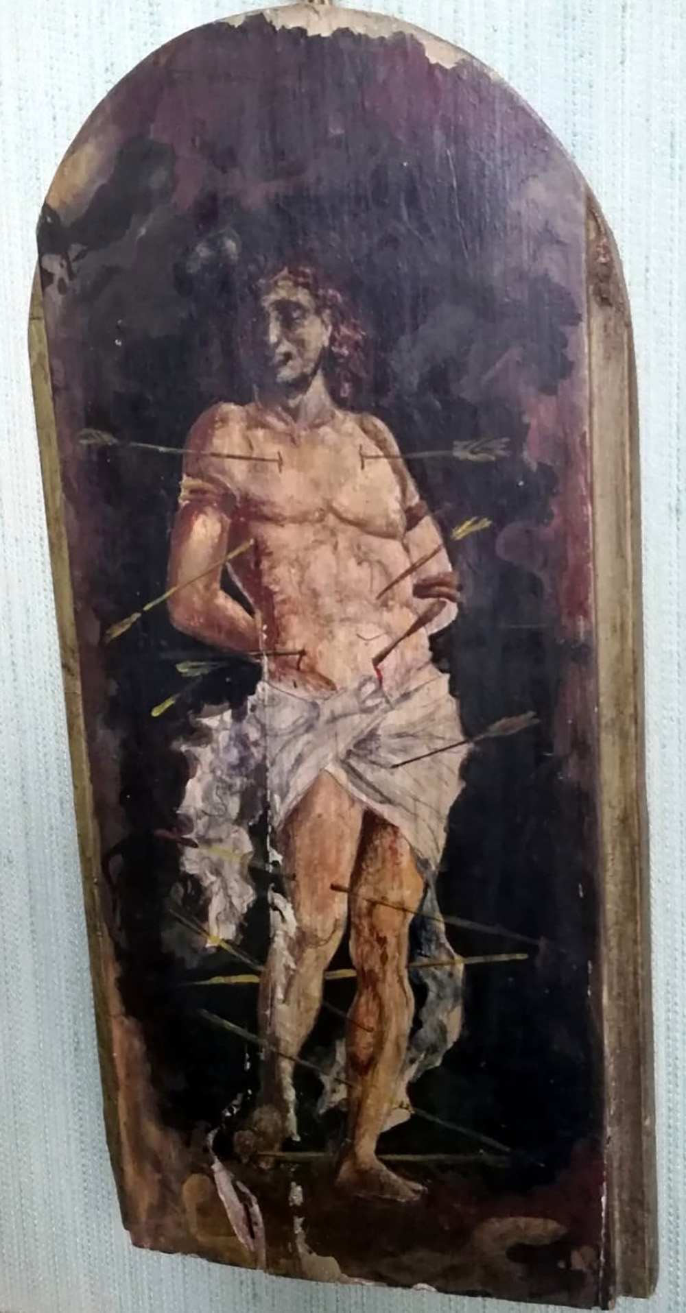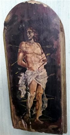 Dipinto su tavola centinata in legno raffigurante San Sebastiano (cm 19x40) (gravi difetti)