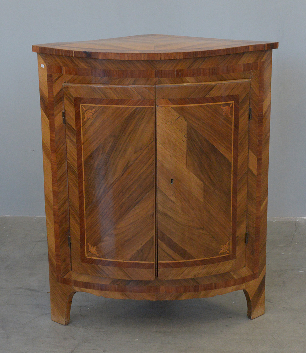 Angoliera fronte curvo a due ante, lastronata in noce e radica di noce e filettata. Decorata a intarsi vegetali, secolo XVIII (cm 60x102x60) (difetti, restauri e sotituzioni)