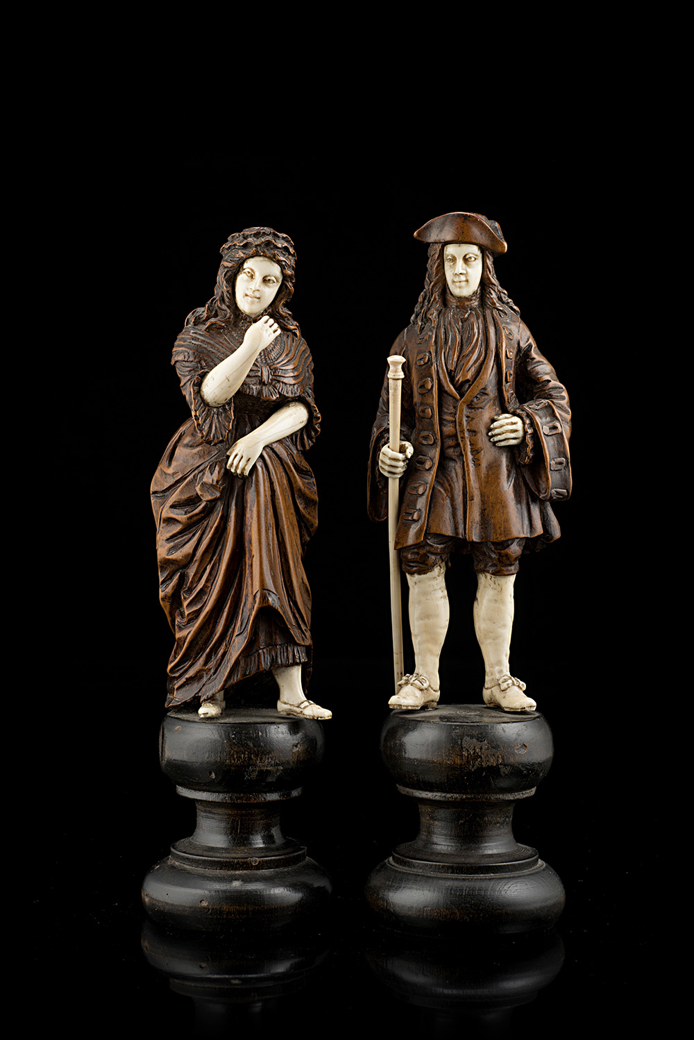 Arte nord europea, secolo XIX. Figure di gentiluomo e gentildonna in bosso e avorio poggianti su basi tornite in legno ebanizzato (h. cm 17) (difetti)
