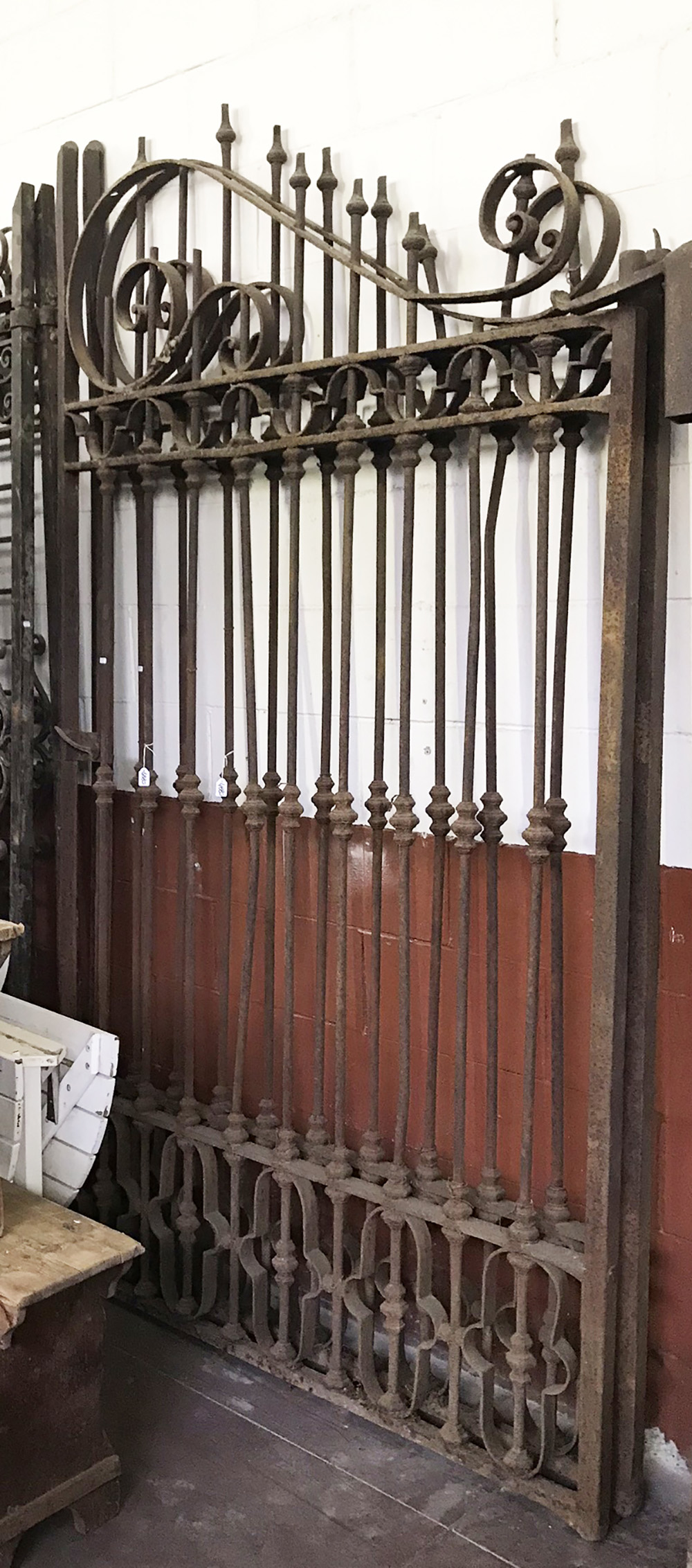 Cancello a due battenti in ferro battuto a colonne e riccioli, inizio secolo XX (cm 235x270) (difetti e mancanze)