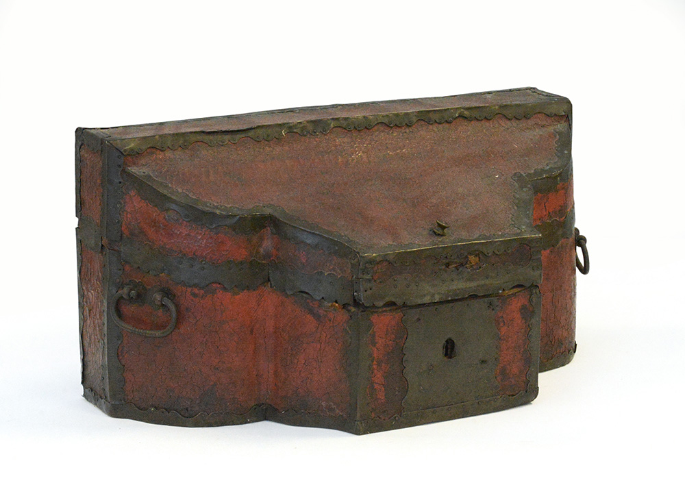 Cassetta portaposate da viaggio di forma sagomata in legno rivestita in cuoio con finiture in ferro battuto, secolo XVIII (difetti e mancanze)
