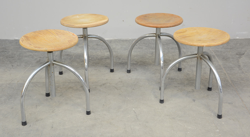 Gruppo di quattro sgabelli tripodi con seduta girevole, struttura in metallo e sedili in legno (difetti)