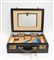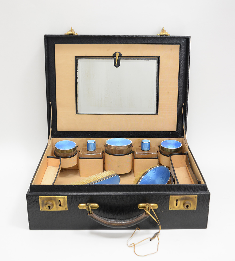 Necessaire da toilette composto da due spazzole e cinque barattoli in vetro con coperchi in argento e smalto celeste, in valigetta completa di specchio, punzoni non decifrati (difetti)