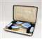 Necessaire da toilette per signora in lamina d’argento con decori a smalto bianco celeste composto da quattro spazzole e uno specchio a mano, in custodia. Punzoni inglesi (difetti)