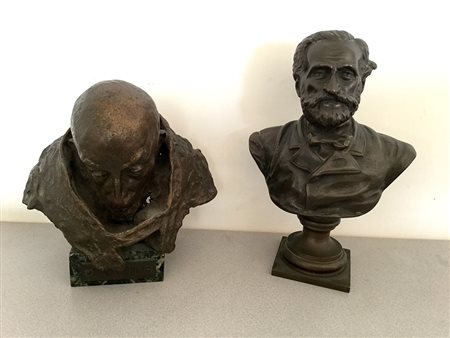 Lotto di sue sculture in bronzo raffiguranti il busto di Giuseppe Verdi e quello di un pontefice (h max cm 19) (lievi difetti)