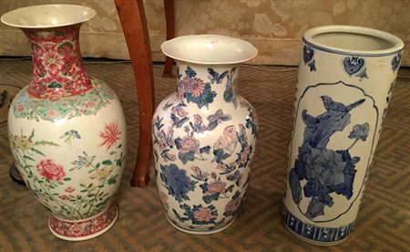 Lotto di tre vasi cinesi in porcellana di fatture differenti (h max cm 40) (difetti e restauri)