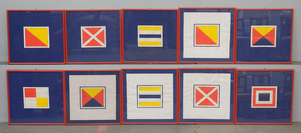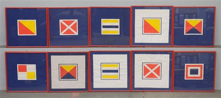 Lotto composto da dieci stampe su tessuto raffiguranti bandiere (cm 40x40), in cornici (difetti)