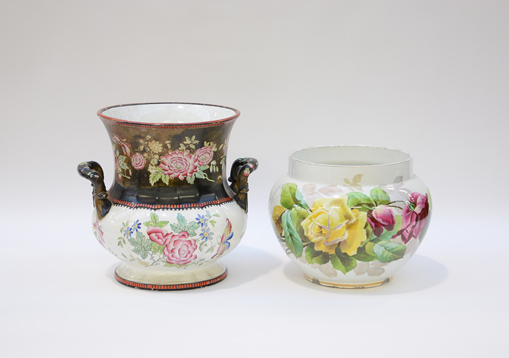 Lotto composto da un vaso biansato in ceramica e un cachepot della manifattura di Laveno, entrambi a decori floreali (difetti)