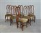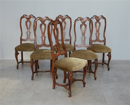 Gruppo di sei sedie con gambe mosse, schienali a giorno e seduta rivestita in...