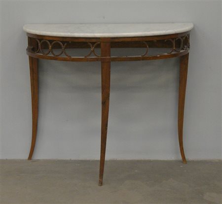 Console a demi- lune con fascia decorata da cerchi e piano in marmo bianco (cm 104x90x49) (gravi difetti e mancanze)