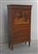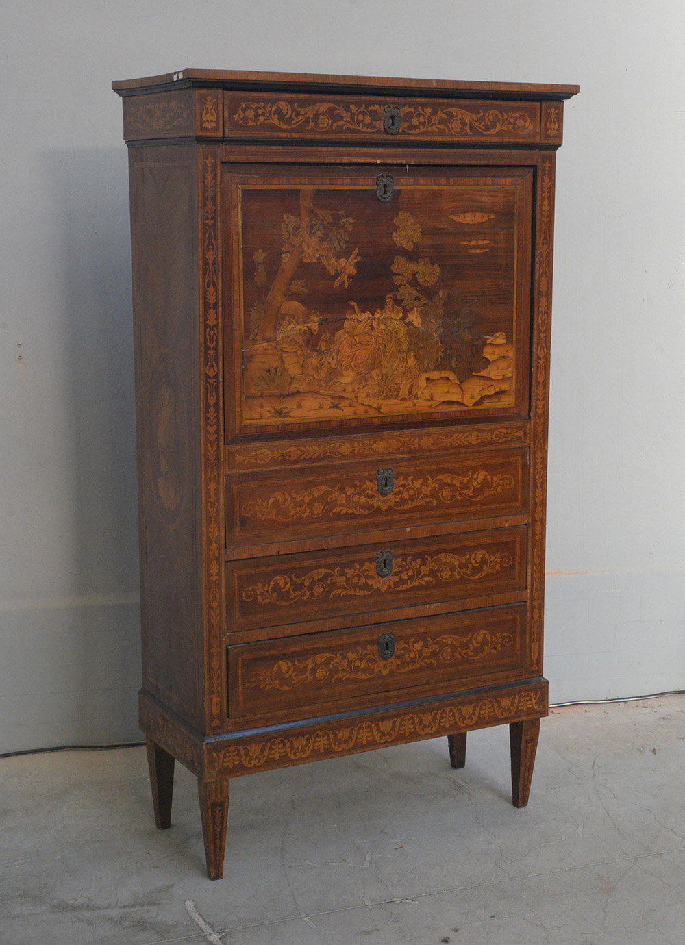 Secretarie interamente lastronato e intarsiato a volute e motivi vegetali, fronte a quattro cassetti e anta riccamente intarsiata in legni vari con figure e animali in un paesaggio. All'interno scarabattolo con cassettini e vani, fianchi decorati da cartigli intarsiati con figure religiose, gambe rastremate (cm 87x158x39). (Difetti)