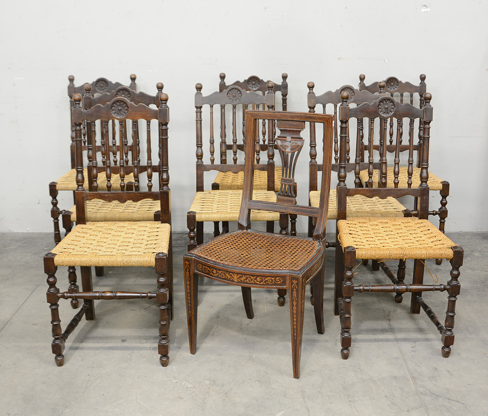 Lotto composto da nove sedie diverse, di cui otto con schienali a listelli (difetti)