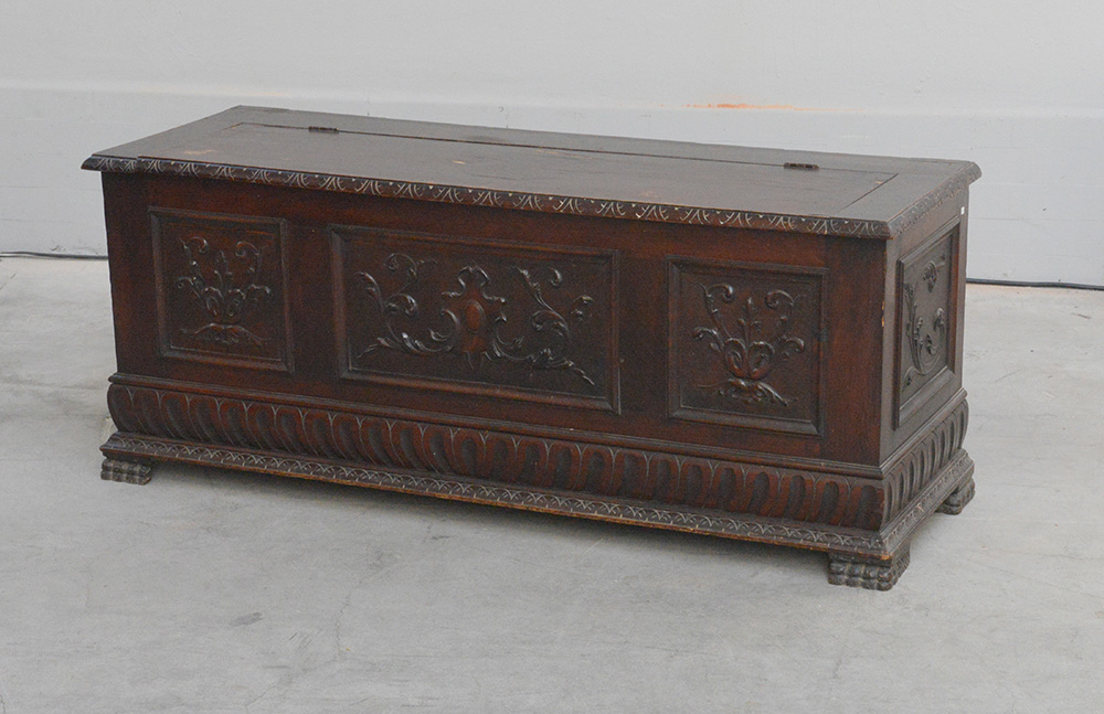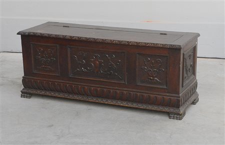 Cassapanca con fronte e fianchi pannellati e intagliati a motivi vegetali, piedi a zampa felina (cm 133x54x46). (Difetti)