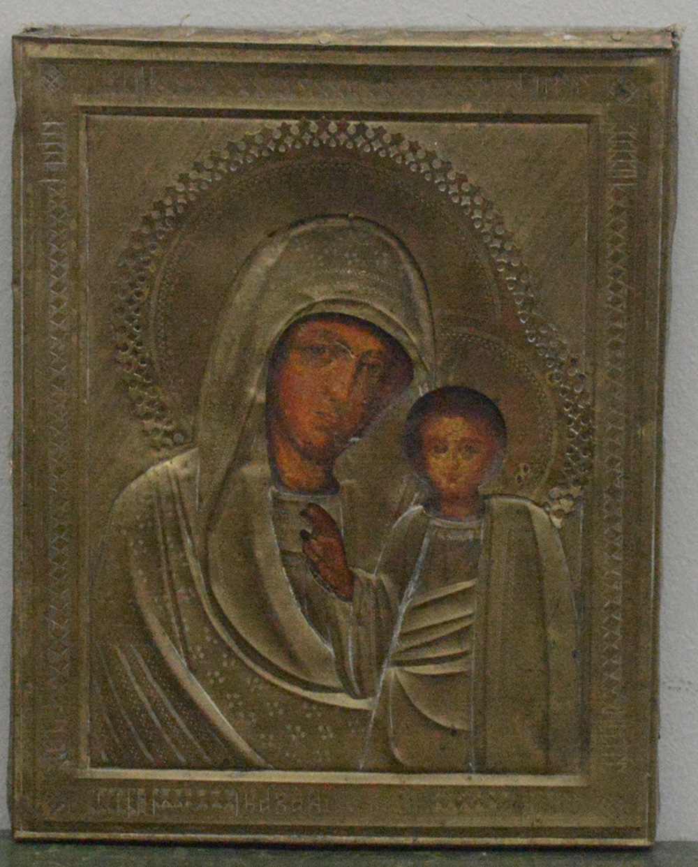 Scuola russa del sec. XIX "Madonna con bambino" icona ad olio su tavola (cm 23x18) con riza in metallo (difetti)