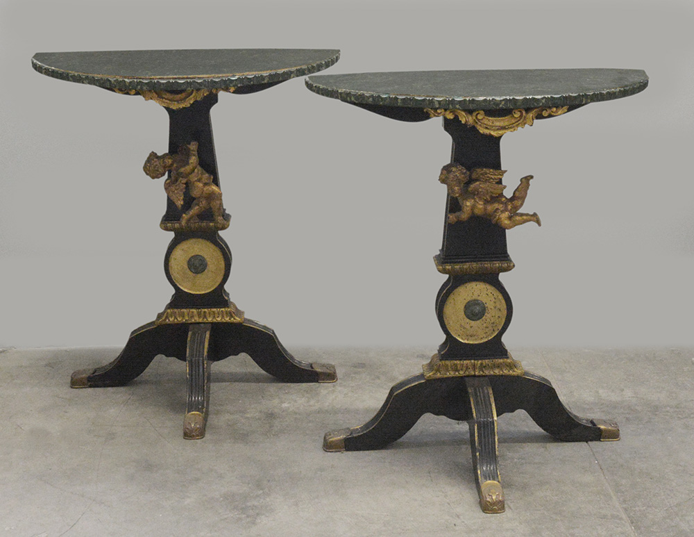 Coppia di consoline tripodi in legno ebanizzato e dorato, gamba centrale dorata da sculture di putti in legno a tutto tondo, piani a mezza luna laccati a finto marmo (cm 65x75x34). (Difetti)