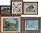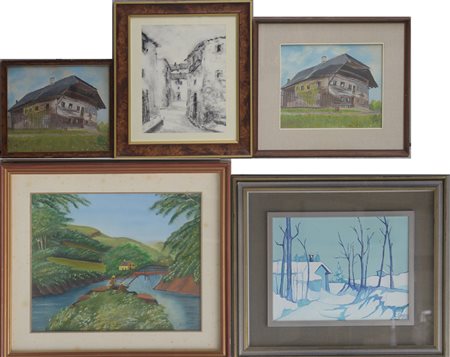 Lotto di quattro dipinti e un pastello raffiguranti paesaggi, autori e misure differenti, in cornici (difetti)