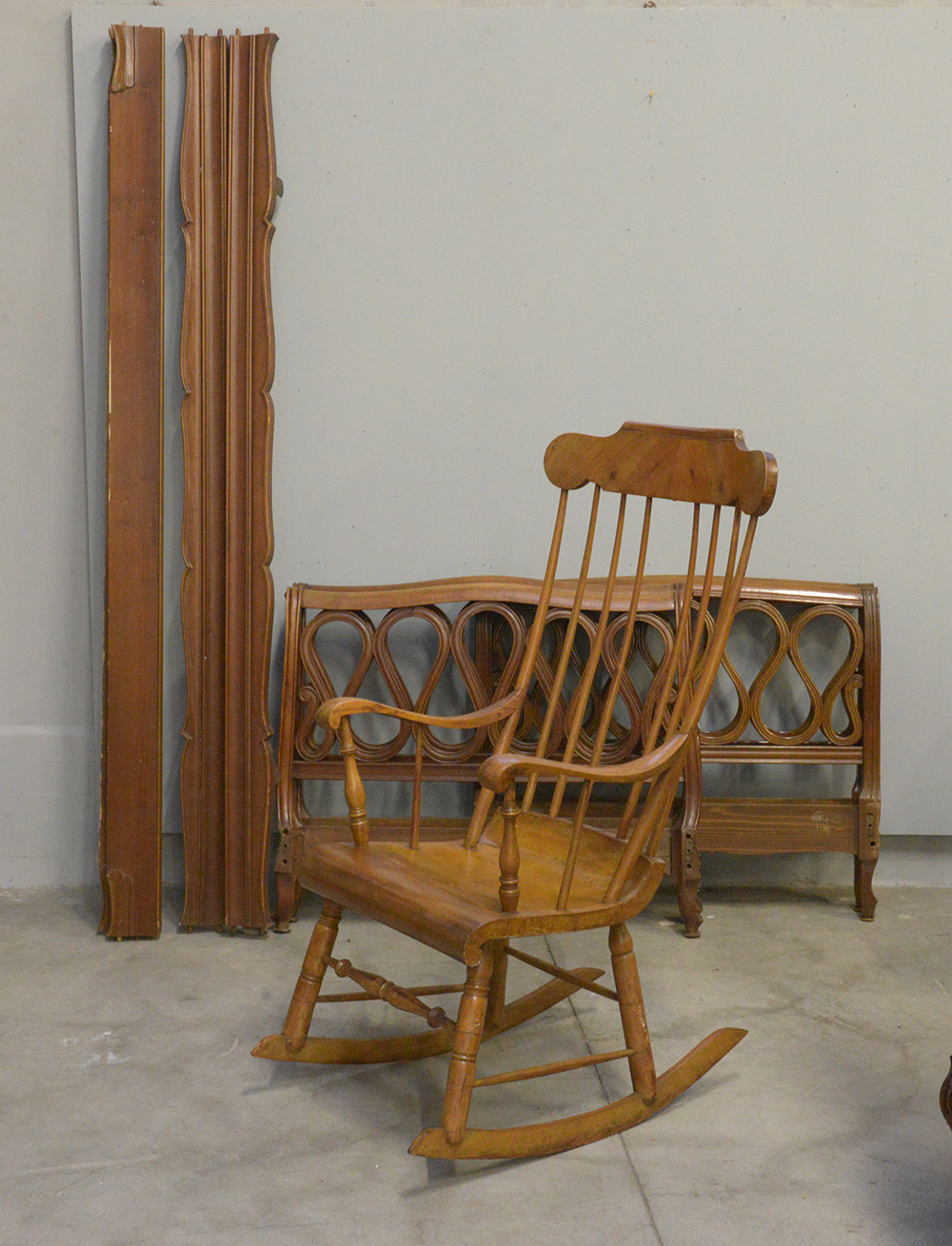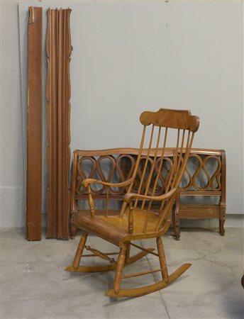 Lotto composto da una coppia di lettini con testate e piediera traforati (completi di reti) e una poltrona a dondolo.(Difetti e mancanze)
