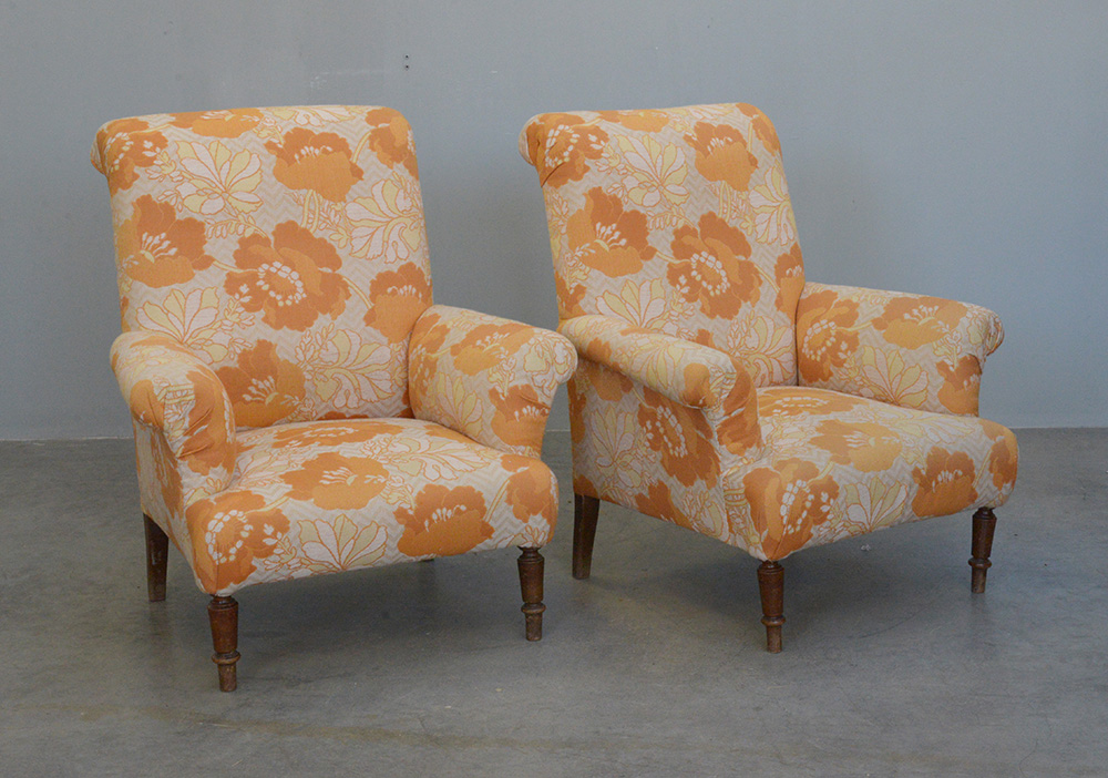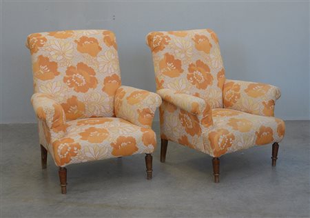 Coppia di poltrone imbottite rivestite con tessuto a fiori, gambe anteriori tornite. Fine secolo XIX. (Difetti)