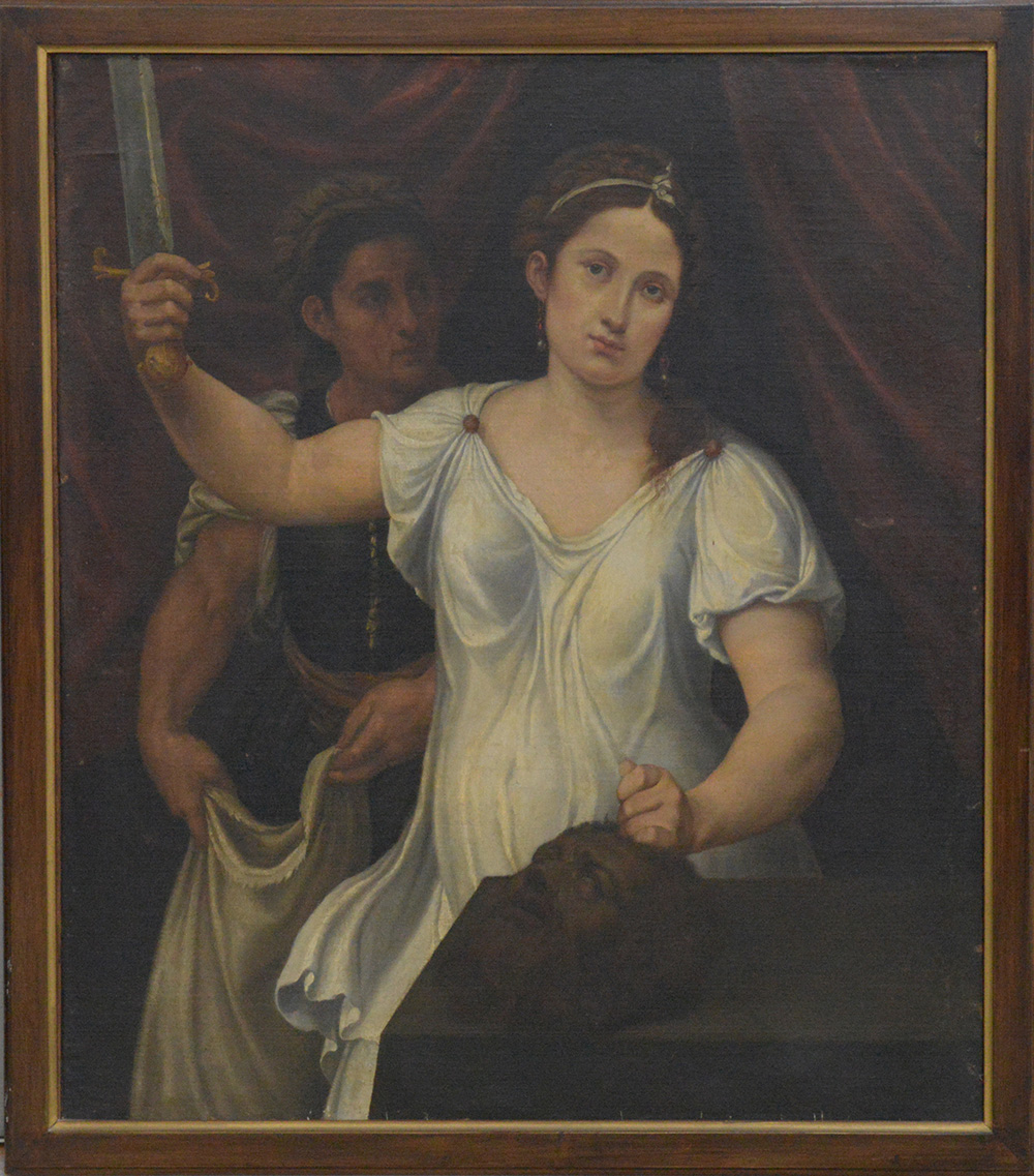Ignoto del XIX Secolo "Giuditta con la testa di Oloferne" olio su tela (cm 108x94) In cornice (difetti)